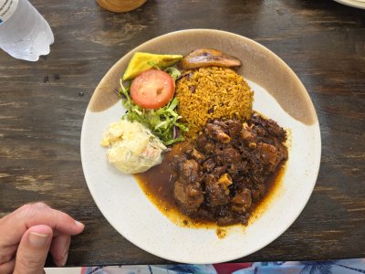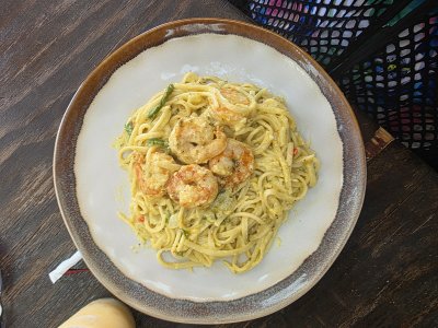 The food was tasty. Ox Tail on left, Shrimp Pasta on right.